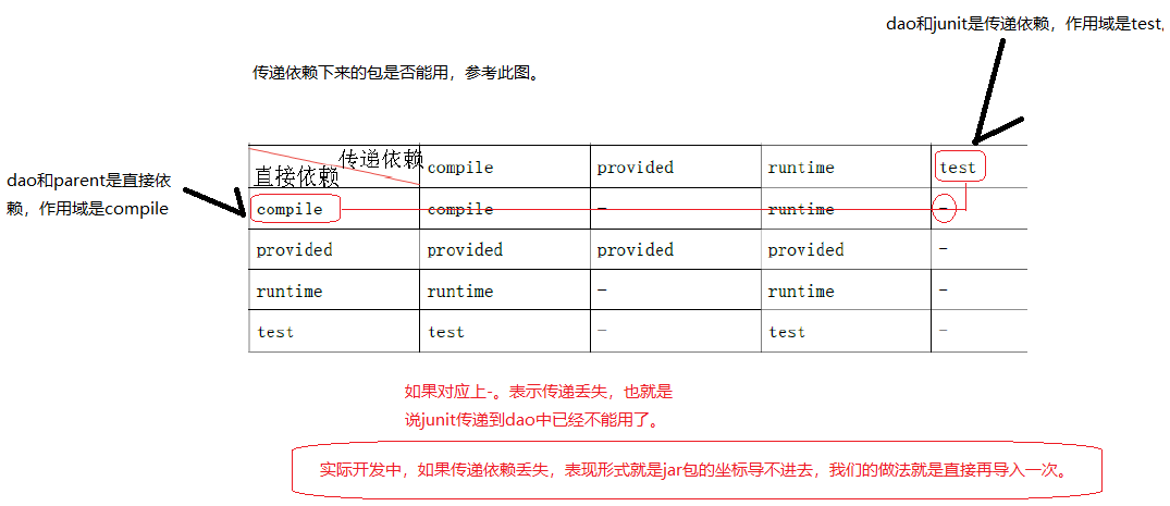 maven 工程是可以分父子依赖关系的。凡是依赖别的项目后,拿到的别的项目的依赖包,都属于传递依赖。比如:当前 A 项目,被 B 项目依赖。那么我们 A 项目中所有 jar 包都会传递到 B 项目中。B 项目开发者,如果再在 B 项目中导入一套 ssm 框架的 jar 包,对于 B 项目是直接依赖。那么直接依赖的 jar 包就会把我们 A 项目传递过去的 jar 包覆盖掉。
