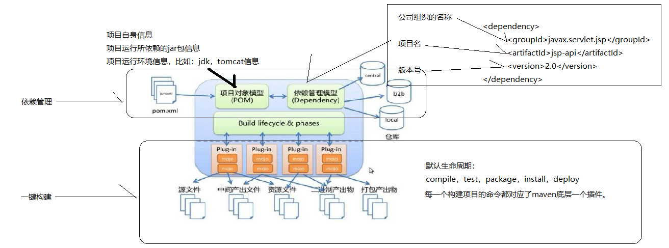 Maven 包含了一个项目对象模型 (Project Object Model),一组标准集合,一个项目生命周期(Project Lifecycle),一个依赖管理系统(Dependency Management System),和用来运行定义在生命周期阶段 (phase)中插件(plugin)目标(goal)的逻辑。